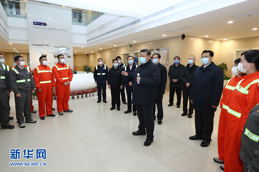 3月29日,中共中央總書記、國家主席、中央軍委主席習近平在浙江考察調研。這是習近平在寧波舟山港穿山港區碼頭了解港口復工復產情況。 新華社記者 鞠鵬 攝