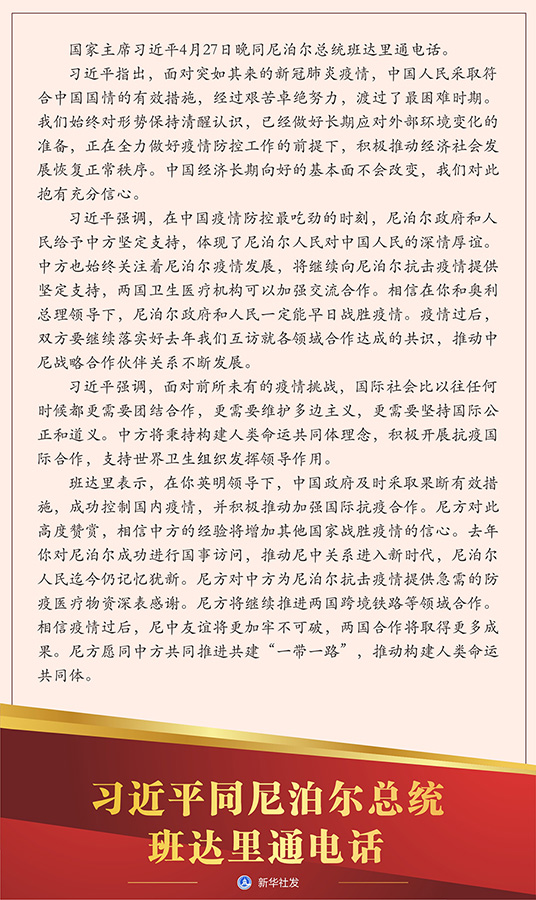 習近平強調,在中國疫情防控最吃勁的時刻,尼泊爾政府和人民給予中方堅定支持,體現了尼泊爾人民對中國人民的深情厚誼。中方也始終關注著尼泊爾疫情發展,將繼續向尼泊爾抗擊疫情提供堅定支持,兩國衛生醫療機構可以加強交流合作。相信在你和奧利總理領導下,尼泊爾政府和人民一定能早日戰勝疫情。疫情過后,雙方要繼續落實好去年我們互訪就各領域合作達成的共識,推動中尼戰略合作伙伴關系不斷發展。