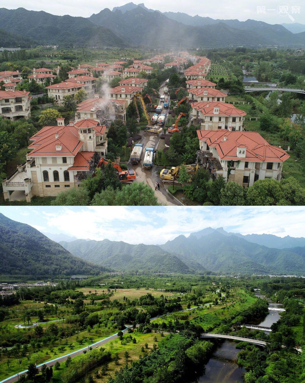 ?↑拼版照片:上圖為2018年9月,西安市長(zhǎng)安區(qū)對(duì)轄區(qū)內(nèi)東大街道的秦嶺違建別墅“群賢別業(yè)”進(jìn)行拆除(新華社記者 邵瑞 攝);下圖為2019年7月拍攝的秦嶺違建別墅“群賢別業(yè)”拆除后建設(shè)的秦嶺和諧森林公園(新華社記者 劉瀟 攝)。