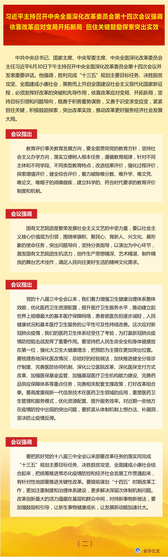會議審議通過了《國企改革三年行動方案(2020-2022年)》、《關于深化新一代信息技術與制造業融合發展的指導意見》、《深化農村宅基地制度改革試點方案》、《關于加快推進媒體深度融合發展的指導意見》、《深化新時代教育評價改革總體方案》、《關于深化國有文藝院團改革的實施意見》。會議還聽取了黨的十八屆三中全會以來醫藥衛生體制改革進展情況匯報。