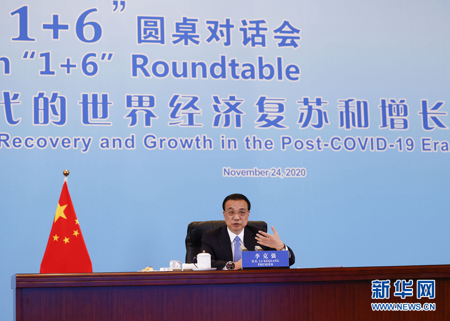 11月24日晚,國(guó)務(wù)院總理李克強(qiáng)在北京釣魚(yú)臺(tái)國(guó)賓館同世界銀行行長(zhǎng)馬爾帕斯、國(guó)際貨幣基金組織總裁格奧爾基耶娃、世界貿(mào)易組織副總干事沃爾夫、國(guó)際勞工組織總干事賴(lài)德、經(jīng)濟(jì)合作與發(fā)展組織秘書(shū)長(zhǎng)古里亞和金融穩(wěn)定理事會(huì)主席夸爾斯舉行第五次“1+6”圓桌對(duì)話會(huì)。會(huì)議以視頻方式舉行。新華社記者 黃敬文 攝