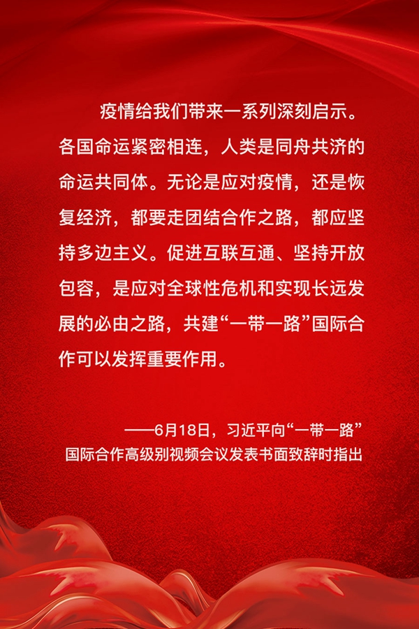 在當前新冠肺炎疫情全球蔓延的特殊背景下,“一帶一路”國際合作高級別視頻會議的舉行,為進一步加強抗疫國際合作和推動高質量共建“一帶一路”注入了新動力,也為疫情陰霾中的世界提振了信心、凝聚了正能量。