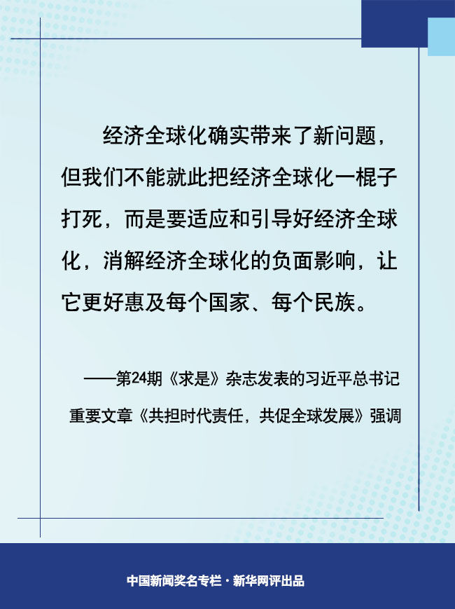 有問題不可怕,可怕的是不敢直面問題,找不到解決問題的思路。面對經濟全球化帶來的機遇和挑戰(zhàn),世界各國要主動作為、適度管理,讓經濟全球化的正面效應更多釋放出來,實現(xiàn)經濟全球化進程再平衡;要順應大勢、結合國情,正確選擇融入經濟全球化的路徑和節(jié)奏;要講求效率、注重公平,讓不同國家、不同階層、不同人群共享經濟全球化的好處。只有把握規(guī)律、認清大勢,共同把經濟全球化動力搞大、阻力搞小,才能順應各國人民對美好生活的向往,讓經濟全球化更好惠及每個國家、每個民族。