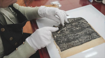 4月27日,参观者在罗家坝遗址博物馆拍摄展出的水陆攻战纹铜豆。