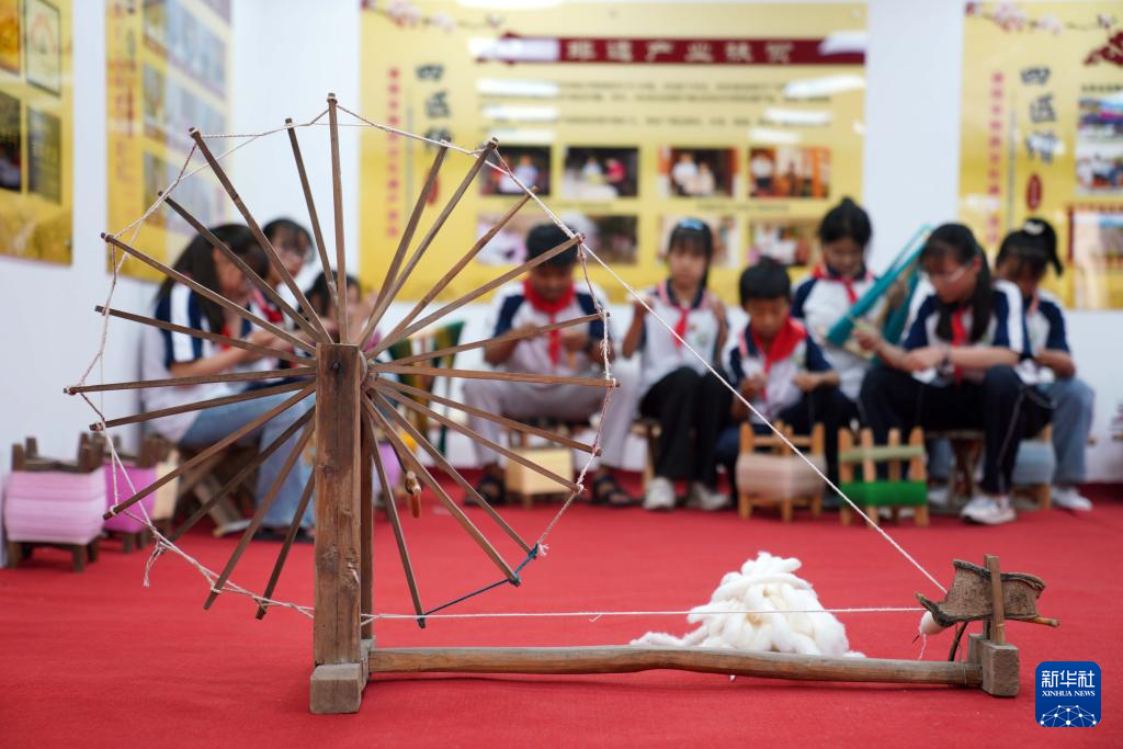5月24日,小学生在河北省沙河市塔子峪村非遗传习所内体验四匹缯布制作技艺。