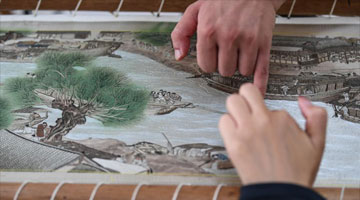 7月21日,孩子们在中国滦州皮影博物馆内参观皮影长卷。