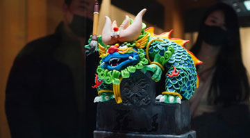 1月13日,在韩国江原道的华川山鳟鱼节现场,游客在哈尔滨工匠制作的大熊猫冰雕作品前留影。