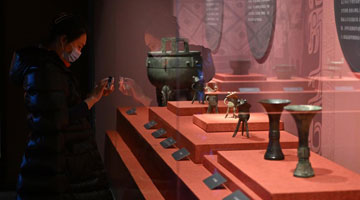 1月13日,在韩国江原道的华川山鳟鱼节现场,游客在哈尔滨工匠制作的韩国光化门冰雕作品前留影。
