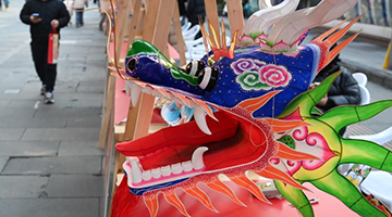 1月28日,艺术家在年俗主题市集上展示龙年主题剪纸。