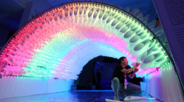 9月18日,工作人员安装调试灯光装饰艺术作品。