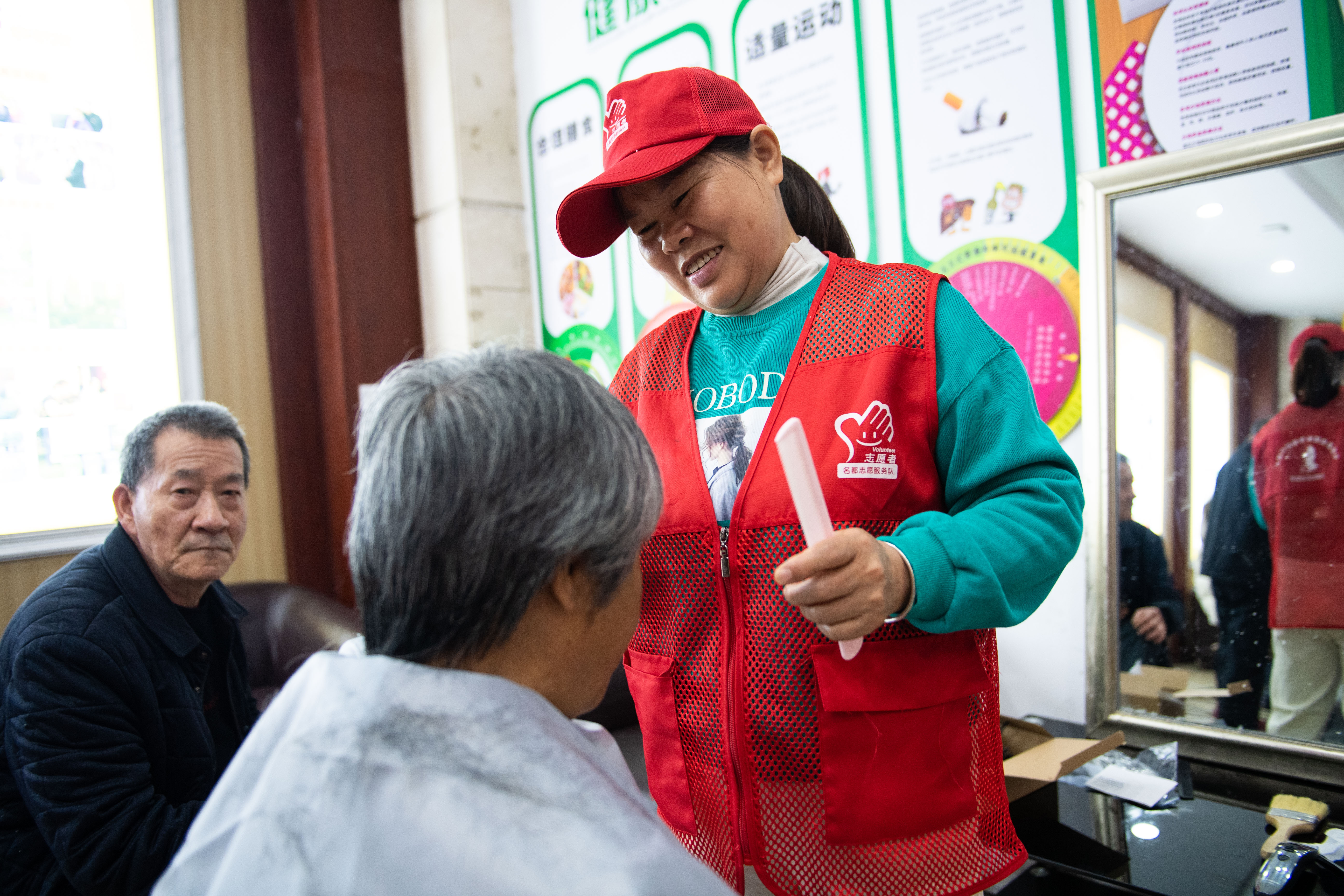 2021年4月21日,在望城名都社区公共服务大厅,志愿者陆君给邻居免费剪头发。新华社记者 陈思汗 摄