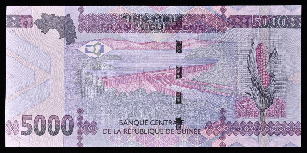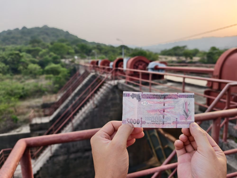 这是2025年4月23日在几内亚以金康水电站为背景拍摄的5000几内亚法郎纸币。