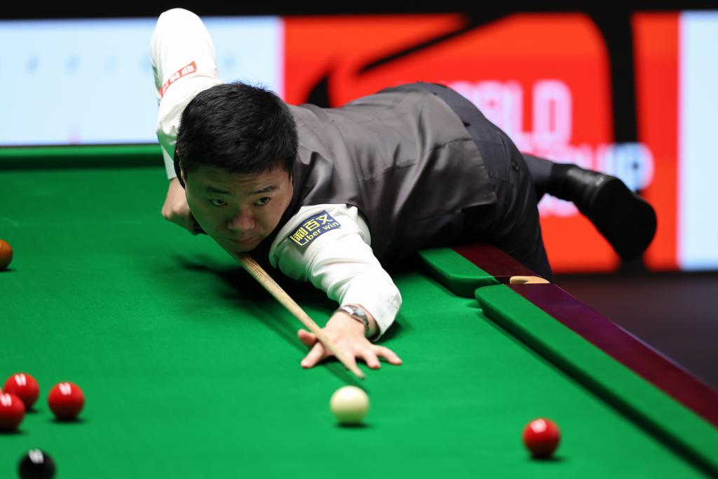 丁俊晖在2025年斯诺克世锦赛首轮比赛中(资料图)。新华社发(翟政 摄)