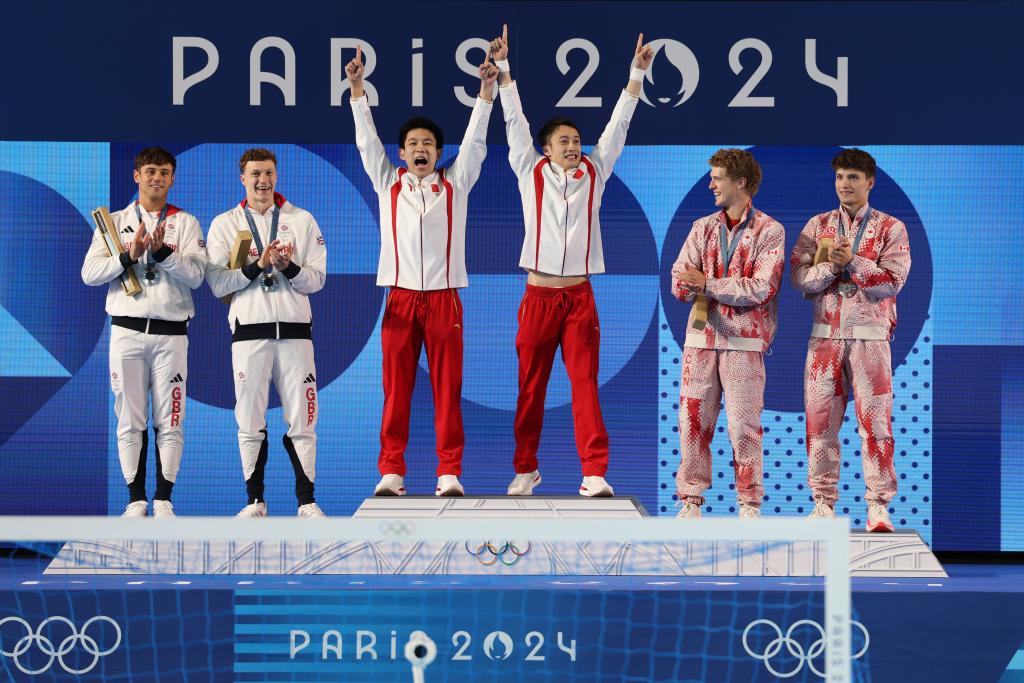 2024年7月29日,中国选手练俊杰(左四)/杨昊(左三)登上领奖台。当日,在巴黎奥运会跳水男子双人十米台决赛中,练俊杰/杨昊夺得金牌。新华社记者 李颖 摄