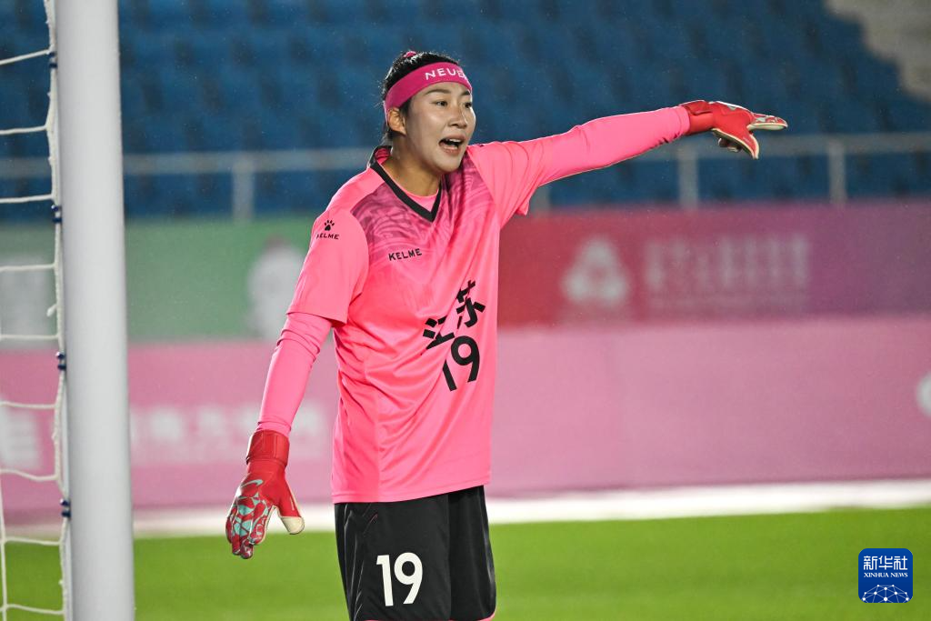 11月4日,江苏队守门员徐欢在比赛中指挥防守。