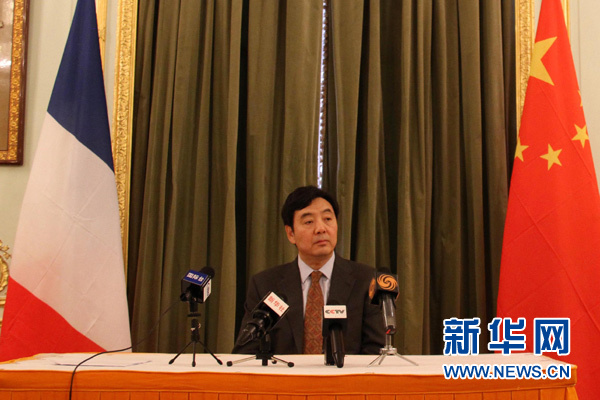 ??? 3月21日,中國駐法國大使翟雋接受駐法中文媒體聯合采訪。中國駐法國大使翟雋日前就習近平主席訪法接受駐法中文媒體聯合采訪時表示,這次訪問是中法建交50周年慶?;顒拥母叱?,是一次具有歷史意義的訪問,將推動中法全面戰略伙伴關系再上新臺階。新華社記者鄭斌攝