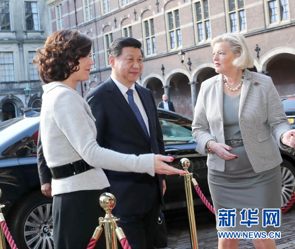 ????3月24日,國(guó)家主席習(xí)近平在海牙會(huì)見(jiàn)荷蘭議會(huì)一院議長(zhǎng)布勒克-克諾爾(右)和二院議長(zhǎng)范米爾滕伯格。 新華社記者 劉衛(wèi)兵 攝