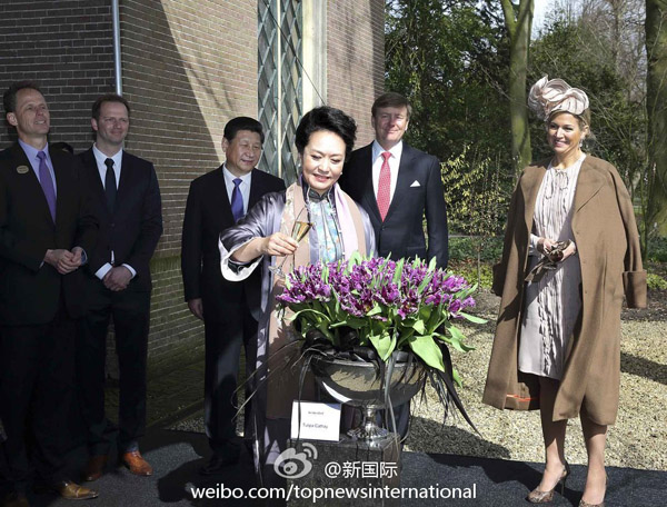 ????新華網(wǎng)北京3月24日電 據(jù)新華社“新國際”微博報(bào)道,荷蘭庫肯霍夫城堡,在習(xí)近平主席、威廉-亞歷山大國王和馬克西瑪王后見證下,習(xí)主席夫人彭麗媛應(yīng)邀為荷蘭新培育的郁金香命名。紫色的郁金香靜靜綻放。按傳統(tǒng),彭麗媛向它澆下香檳,輕聲命名“Cathay”,寓意“國泰”。馬克西瑪王后將“國泰”贈予彭麗媛。?