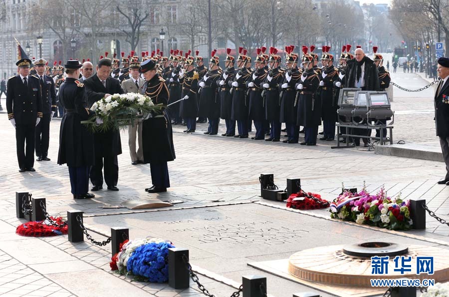 ?3月27日,國家主席習(xí)近平在巴黎向法國無名烈士墓獻(xiàn)花圈。新華社記者龐興雷攝