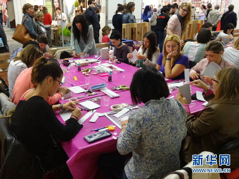 ????4月26日,巴塞羅那第一屆“手工藝品節”(Handmade Festival Barcelona)的體驗區,一些參觀者在工作人員的指導下現場體驗手工制作。