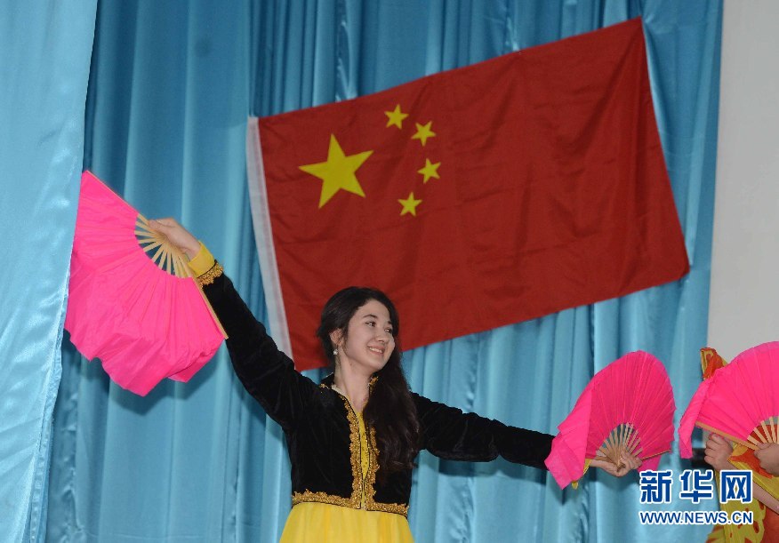 6月9日,學生代表在烏茲別克斯坦首都塔什干的烏世界語言大學禮堂表演節目。