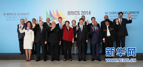 ????新華網(wǎng)巴西利亞7月16日電(記者陳威華、錢彤)7月16日,金磚國(guó)家同南美國(guó)家領(lǐng)導(dǎo)人對(duì)話會(huì)在巴西利亞舉行。中國(guó)國(guó)家主席習(xí)近平、巴西總統(tǒng)羅塞夫、俄羅斯總統(tǒng)普京、印度總理莫迪、南非總統(tǒng)祖馬以及蘇里南總統(tǒng)鮑特塞、阿根廷總統(tǒng)克里斯蒂娜、玻利維亞總統(tǒng)莫拉萊斯、哥倫比亞總統(tǒng)桑托斯、智利總統(tǒng)巴切萊特、厄瓜多爾總統(tǒng)科雷亞、圭亞那總統(tǒng)拉莫塔爾、巴拉圭總統(tǒng)卡特斯、秘魯總統(tǒng)烏馬拉、烏拉圭總統(tǒng)穆希卡、委內(nèi)瑞拉總統(tǒng)馬杜羅等南美國(guó)家領(lǐng)導(dǎo)人共同出席。