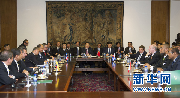 ??? 當地時間7月17日,國家主席習近平在巴西利亞會見拉美和加勒比國家共同體輪值主席國哥斯達黎加總統索利斯、前任輪值主席國古巴國務委員會主席兼部長會議主席勞爾·卡斯特羅、候任輪值主席國厄瓜多爾總統科雷亞、加勒比共同體輪值主席國安提瓜和巴布達總理布朗。新華社記者 謝環馳 攝
