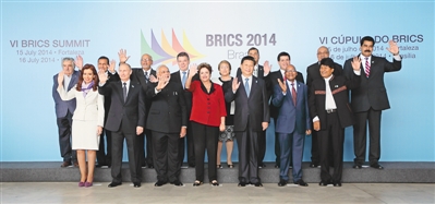 本報巴西利亞7月16日電 (記者杜尚澤、丁剛)7月16日,金磚國家同南美國家領導人對話會在巴西利亞舉行。中國國家主席習近平、巴西總統羅塞夫、俄羅斯總統普京、印度總理莫迪、南非總統祖馬以及蘇里南總統鮑特塞、阿根廷總統克里斯蒂娜、玻利維亞總統莫拉萊斯、哥倫比亞總統桑托斯、智利總統巴切萊特、厄瓜多爾總統科雷亞、圭亞那總統拉莫塔爾、巴拉圭總統卡特斯、秘魯總統烏馬拉、烏拉圭總統穆希卡、委內瑞拉總統馬杜羅等南美國家領導人共同出席。