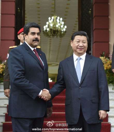 ????新華網(wǎng)北京7月21日電 據(jù)新華社“新國際”微博報道,習近平20日同馬杜羅總統(tǒng)會談時說,我們要加強頂層設計,以金融和投資為引擎,以能源合作為主軸,基礎設施建設、農(nóng)業(yè)、礦業(yè)、科技合作等多個輪子一起轉,促進中委合作全方位發(fā)展。(李學仁攝)
