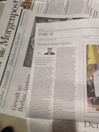 抵達(dá)前夕,克強(qiáng)總理通過(guò)德國(guó)主流媒體《世界報(bào)》,以“讓開放創(chuàng)新引領(lǐng)中德合作”為題,向德國(guó)人民問(wèn)好并聊起對(duì)中德關(guān)系未來(lái)發(fā)展的期望。可謂是人未到,聲先至。