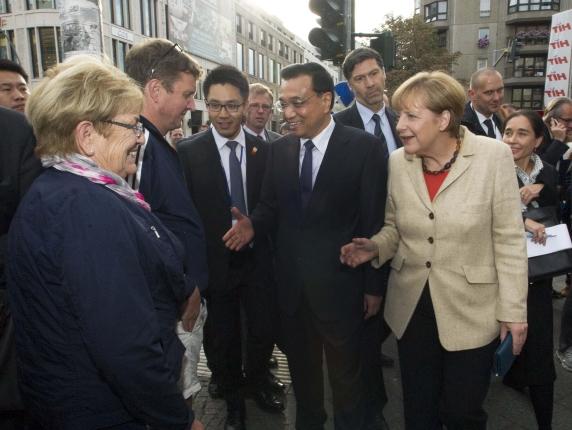 見到兩國總理到來,路邊不少民眾圍了上來,爭相與他們握手、合影。默克爾還把克強(qiáng)總理介紹給一位7、8歲的德國小女孩:“這是我的中國同事。”