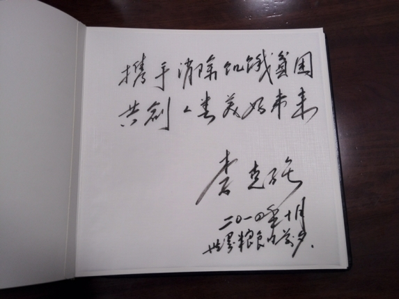 ????石板前面擺放著一張簽字桌,桌上放著一本叫做golden book(金書)的簽到簿,是專供到訪的國家領導人用的。克強總理在上面寫下了這樣一句話“攜手消除饑餓貧困 共創人類美好未來”。