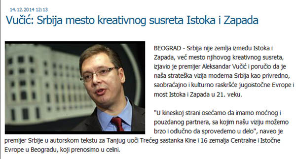 塞爾維亞總理武契奇14日在塞爾維亞南通社發(fā)表題為《塞爾維亞是東西方創(chuàng)造性相遇的地方》的署名文章。文章稱(chēng),塞爾維亞不是夾在東西方之間的國(guó)家,而是東西方創(chuàng)造性相遇的地方。他表示,一個(gè)現(xiàn)代化的塞爾維亞(應(yīng))成為東部歐洲經(jīng)濟(jì)、交通、文化的交叉點(diǎn)以及21世紀(jì)東西方的橋梁。他說(shuō),中國(guó)是強(qiáng)大的和值得信賴(lài)的伙伴,通過(guò)同中國(guó)的合作,塞爾維亞可以很快、堅(jiān)定地去實(shí)施自己的戰(zhàn)略預(yù)想。武契奇還引用《孫子兵法》作者孫武的話(huà)“如果你善于利用機(jī)會(huì),機(jī)會(huì)會(huì)增加”,表示賽爾維亞將緊緊抓住現(xiàn)在的機(jī)遇,為自己的發(fā)展創(chuàng)造新的機(jī)會(huì)。