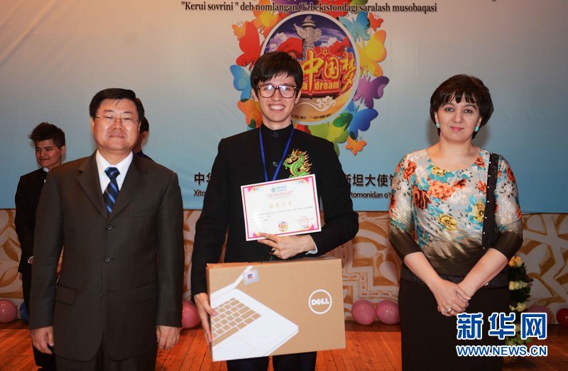 4月28日,在烏內務部文化宮禮堂,來自撒馬爾罕國立外國語學院的扎爾卡毛(中文名:康曉鑫)獲得特等獎。新華網記者 沙達提攝