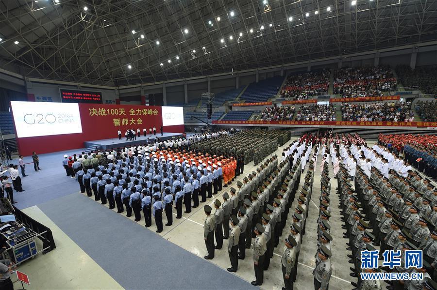 ??? 5月27日,駐杭部隊官兵、武警官兵、公安干警、志愿者、醫(yī)護人員、賓館保障人員及各界代表參加誓師大會。 當日,“決戰(zhàn)100天全力保峰會”迎接G20誓師大會在浙江杭州舉行。 新華社記者黃宗治攝
