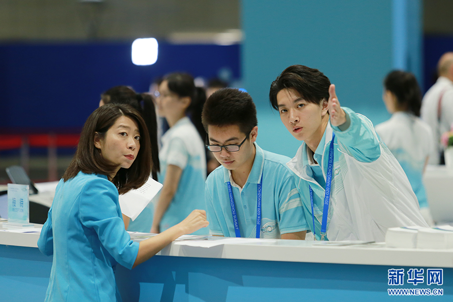 ????“小青荷”是此次峰會志愿者的代名詞。這個名字取自宋代詩人楊萬里描寫杭州的詩句“接天蓮葉無窮碧,映日荷花別樣紅”,“青荷”也音同“親和”,他們成了G20杭州峰會新聞中心里一道亮麗的風(fēng)景。新華網(wǎng) 祝立銘 攝