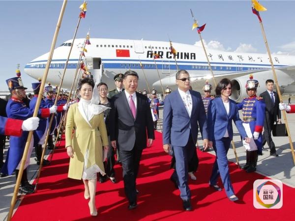 為了迎接習(xí)主席夫婦,科雷亞總統(tǒng)打破厄國(guó)內(nèi)《公共典禮條例》和總統(tǒng)不赴機(jī)場(chǎng)迎送外國(guó)元首的慣例,親赴機(jī)場(chǎng)主持隆重的歡迎儀式;兩名身著民族服裝的當(dāng)?shù)貎和蛄?xí)主席夫婦獻(xiàn)上鮮花;兩國(guó)元首登上檢閱臺(tái),軍樂(lè)隊(duì)奏響中厄兩國(guó)國(guó)歌。習(xí)主席和科雷亞總統(tǒng)分別發(fā)表了熱情洋溢的致辭。