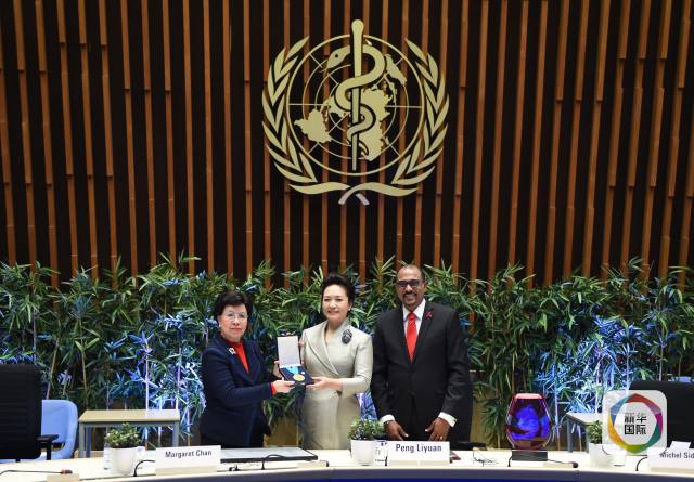 當地時間18日下午5時許,在熱烈的掌聲中,世界衛生組織總干事陳馮富珍和聯合國艾滋病規劃署執行主任西迪貝向彭麗媛頒發親善大使任期續延證書、世衛組織榮譽勛章和艾滋病防治“杰出成就獎”獲獎證書及獎杯,并合影留念。