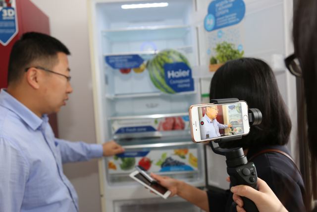 海爾在俄羅斯韃靼斯坦共和國的冰箱工廠內,海爾員工介紹冰箱功能。(新華社記者趙宇攝)