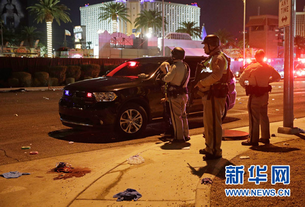 10月2日,在美國西部城市拉斯維加斯,警察在槍擊事件現場警戒。新華社/美聯