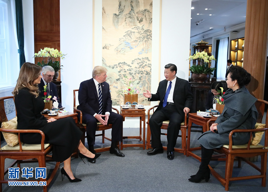 11月8日下午,國家主席習近平和夫人彭麗媛在北京故宮博物院迎接來華進行國事訪問的美國總統特朗普和夫人梅拉尼婭。兩國元首夫婦在寶蘊樓簡短茶敘。新華社記者蘭紅光攝