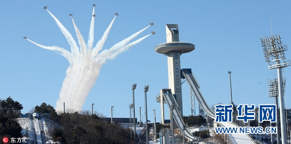 當地時間2017年12月21日,韓國平昌,距離2018年平昌冬奧會開幕僅剩50天,韓國空軍黑鷹特技飛行隊在阿爾卑西亞體育場上空進行精彩表演。(圖片來源:東方IC)