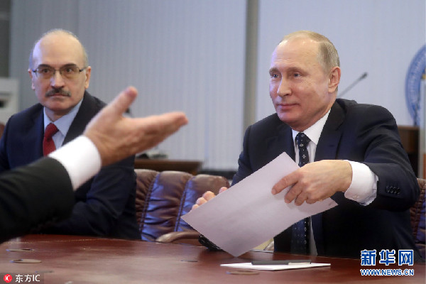 當地時間27日,俄羅斯莫斯科,俄羅斯總統普京親自向俄中央選舉委員會遞交參加2018年總統大選的文件。俄羅斯將于2018年3月18日舉行總統大選。