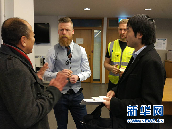 12月27日,在冰島雷克雅未克,中國駐冰島大使館工作人員與冰島國家救援中心人員交談。新華社發(fā)