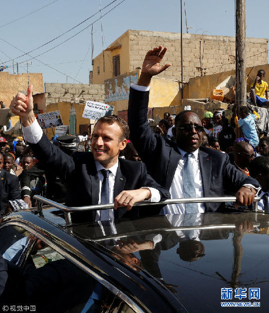 當(dāng)?shù)貢r間2月3日,塞內(nèi)加爾圣路易,塞內(nèi)加爾總統(tǒng)馬基·薩勒陪到訪的法國總統(tǒng)馬克龍造訪當(dāng)?shù)兀瑑扇顺塑囅蛎癖娭乱狻#▓D片來源:視覺中國)