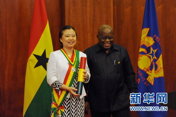 4月10日,加納總統阿庫福-阿多向中國駐加納大使孫保紅授予“加納之星”榮譽勛章。新華網記者石松 攝