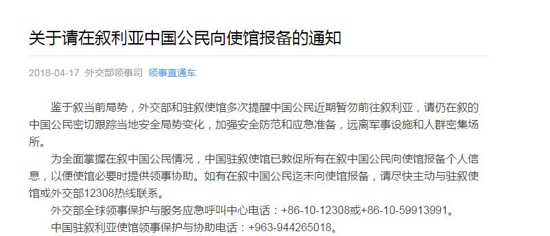 中國(guó)駐敘利亞使館領(lǐng)事保護(hù)與協(xié)助電話:+963-944265018。