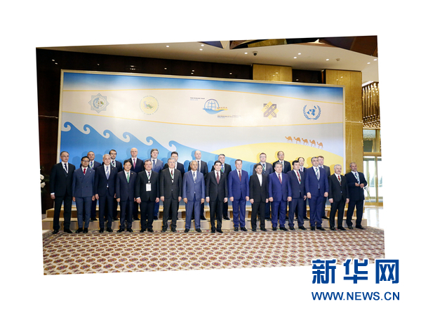 參加“偉大的絲綢之路——邁向新發展”國際論壇的貴賓同土庫曼斯坦總統別爾德穆哈梅多夫合影。新華社記者 周良攝