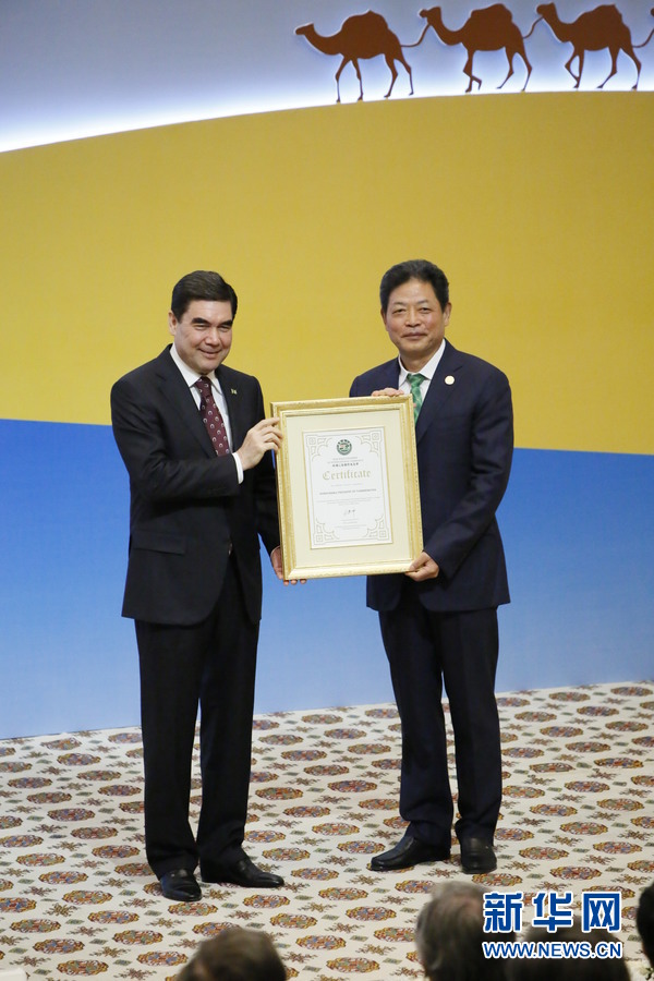 論壇開幕式上,絲綢之路國際總商會主席呂建中代表該商會向別爾德穆哈梅多夫頒發“復興絲綢之路榮譽證書”。新華社記者 周良攝