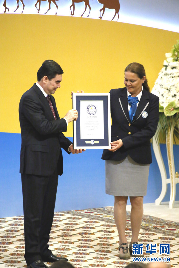 5月2日,世界吉尼斯紀錄總部的代表向土庫曼斯坦總統頒發相關證書。新華社記者 周良攝